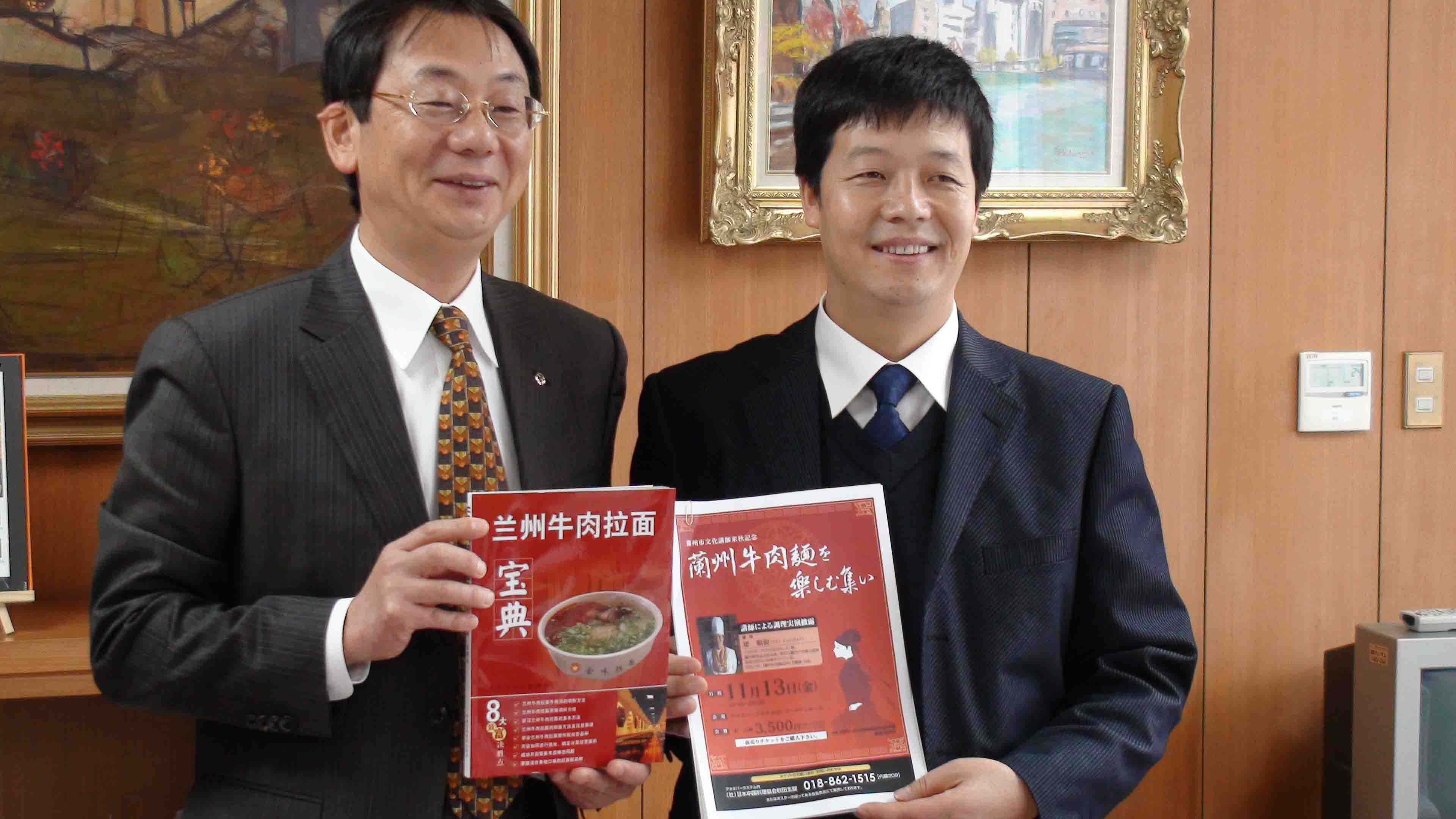 文化講師梁順儉將自己編著的蘭州牛肉拉面寶典一書贈給日本秋市長穗積志先生