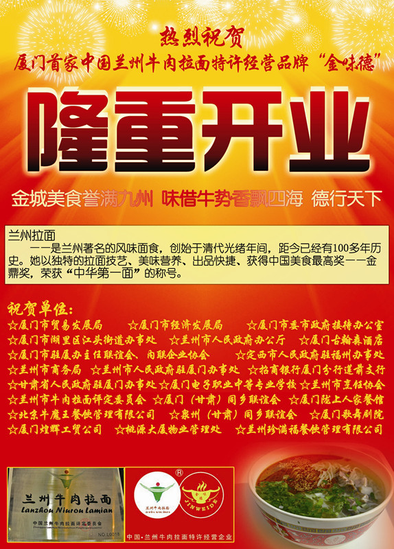 熱烈祝賀福建廈門金味德餐飲管理有限公司暨金味德蘭州牛肉拉面臺灣街店五一開業大吉