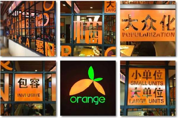 經(jīng)過細(xì)致分析設(shè)計(jì),并提出創(chuàng)意方案,設(shè)計(jì)師為“橘子”餐廳打造了一個(gè)以黑色背景為主題,綠色、橙色兩種色彩構(gòu)成簡潔LOGO,“橘子”LOGO和背景色澤形成超級色彩反差,將“橘子”LOGO變成了店鋪的超級標(biāo)簽。利用燈光加亮的效果,最后從商場的各個(gè)角度都能非常明顯的看到“橘子”餐廳的LOGO,這一創(chuàng)意設(shè)計(jì)成功占領(lǐng)了消費(fèi)者的眼光。