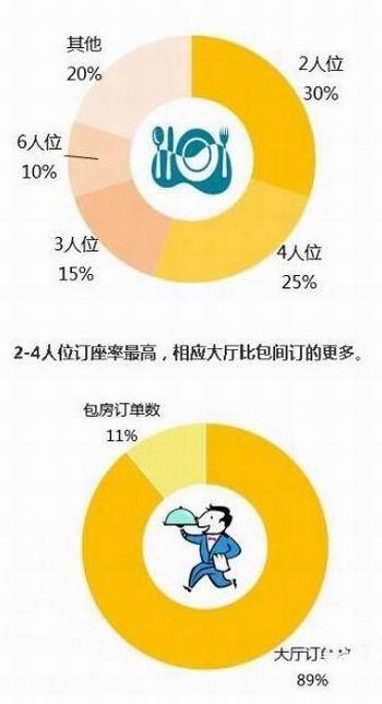2--4人位訂座率最高,相應大廳比包間訂的更多。