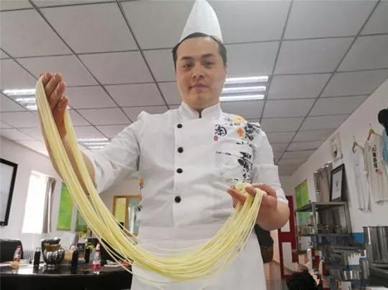 蘭州牛肉面大學堂里,西班牙青年吳榮剛(Terry Wu)在一群中國學員中格外惹眼。他手中的面團經過揉、搓、遛、扯、抻后,十幾秒的時間變魔術般把一個白面團拉成了細滑如絲的面條。