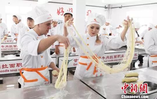 2018年4月11日,來自哈薩克斯坦、澳大利亞等國學員在蘭州學習牛肉面制作工藝。(資料圖)