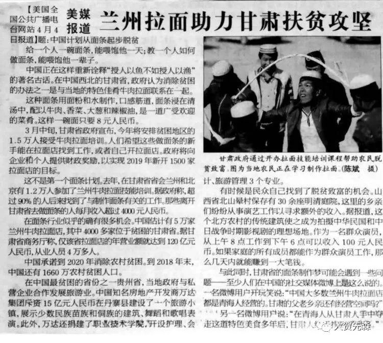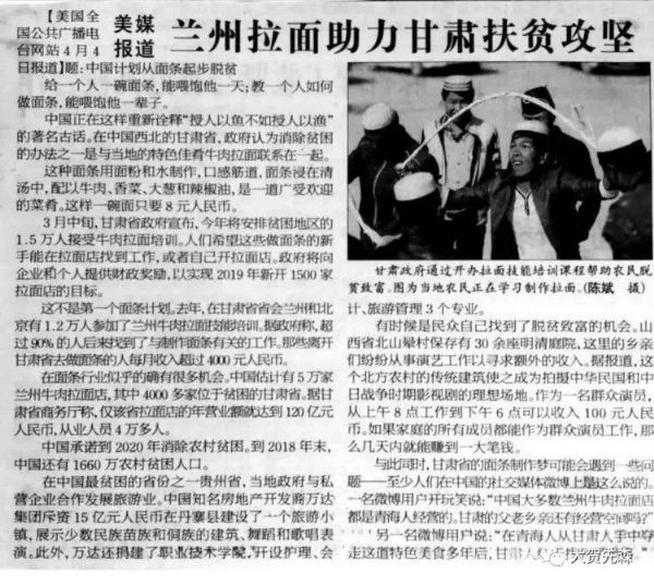 在中國西北的甘肅省,政府認為消除貧困的辦法之一是與當地的特色佳肴牛肉拉面聯系在一起。這種面條用面粉和水制作,口感筋道,面條浸在清湯中,配以牛肉、香菜、大蔥和辣椒油,是一道廣受歡迎的菜肴。這樣一碗面只要8元人民幣。