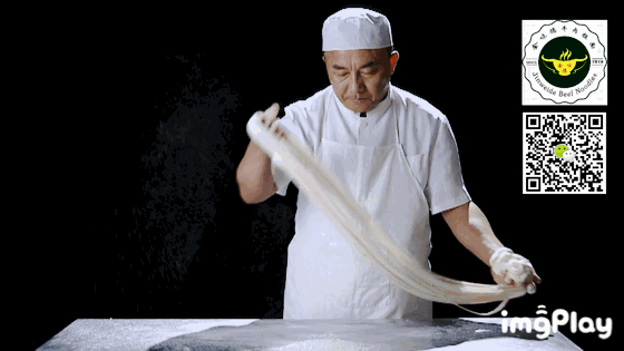 拉面師傅專門從蘭州而來,功夫了得。不僅臂力過人,而且對拉面力道的控制剛中帶柔。下到鍋里依舊韌性十足!