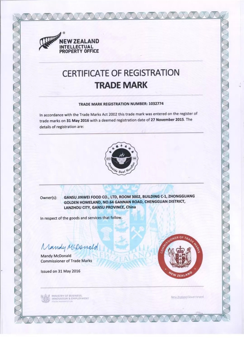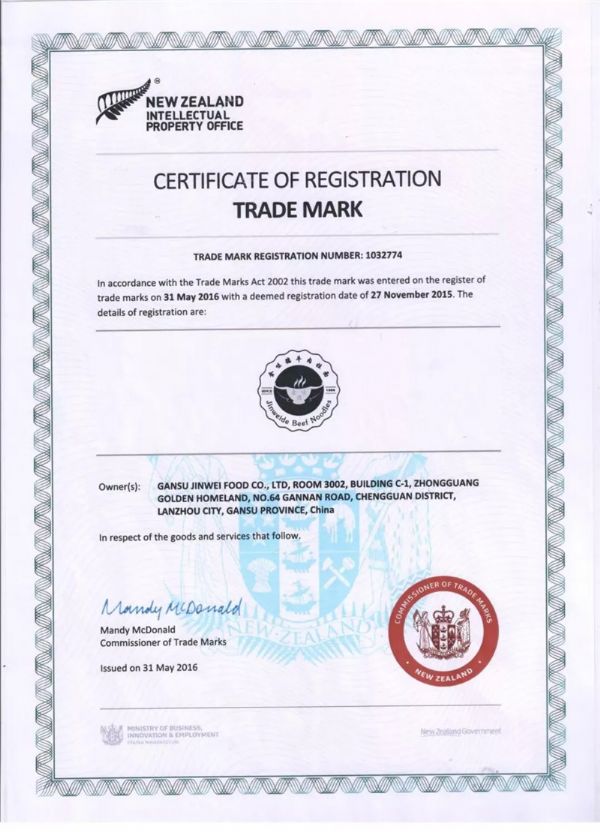 金味德牛肉拉面品牌在中國蘭州發展10年以來,在全球四十多個國家注冊商標,近年來借助國家“一帶一路”的發展機遇,積極推動中國飲食文化走向世界,在40多個國家注冊商標,相繼在韓國、日本、美國、奧大利亞等多個國家開展連鎖業務,成為中國蘭州牛肉拉面國際連鎖領軍品牌,引起越來越多國家強烈響應。2018年10月金味德新西蘭公司連鎖店同時啟動,開展新西蘭全國金味德牛肉拉面連鎖業務,將為新西蘭從事蘭州牛肉拉面行業的同仁提供技能培訓,人才供應,技術輸出,原材料供應,模式復制等全產業連服務。