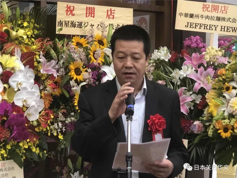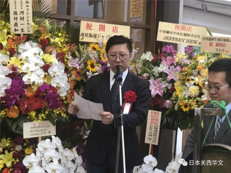 創辦人、中華蘭州拉面株式會社社長康主恩首先致辭。他表示:蘭州牛肉拉面作為中國甘肅省非物質文化遺產,近年來在甘肅省政府和中國蘭州牛肉拉面國際聯盟的大力推廣和協力下,已經走向世界。作為在日本的華人深感自豪和負有責任。特別是去年經中國駐大阪總領事館孫淑強領事和甘肅省商務廳張應華廳長的大力倡導下,覺得應該為中日間的文化交流盡綿薄之力。拉面在日本深受歡迎和喜愛,日本更是面條創新和研發方面的先行者,蘭州牛肉拉面必將在日本有更多更好的推廣和發展空間。為此我們以匠心為己任,用心做好一碗面為己任,以神戶牛骨,精選和牛肉,天然布引水為料,用百年蘭州拉面的調味料絕密配方,而精心調制出的牛肉湯,再以手工拉制9種面條,以一清二白三紅四綠五黃為特色的蘭州牛肉拉面呈現給日本大眾,在食拉面過程中,再配以高級胡椒粉和陳年老醋或檸檬汁,食出不同于傳統的日本拉面的風味。
