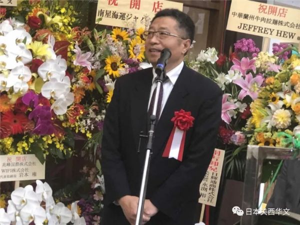 日本友好人士、日中經貿中心常務理事池田稔也在現場發言。他先介紹了日本拉面的歷史,同時表示:“在中國,面的歷史非常悠久,各類繁多,其中蘭州拉面是最有名的面,在中國在哪里都能吃到的老百姓喜歡的面之一。”他說:“在中國最有名的蘭州拉面來到神戶了,在神戶跟世界上最有名的神戶牛肉匯合,成為蘭州牛肉拉面了。這拉面是在中國、在日本或者在全世界的哪里都不能品嘗的,世界第一的蘭州神戶牛肉拉面�!背靥锵壬瑫r表示:日本的很多文化習慣是從中國學過來的,現在日本和中國之間有多方面的合作�!爸孕南M@蘭州牛肉拉面作為中國和日本的飲食文化合作的結晶,成為很多人喜歡的,許多人吃的神戶名菜�!绷硪晃恢匾钨e、中國駐大阪總領館商務室負責人孫淑強也發表了講話,對神戶蘭州拉面店開業表示熱烈祝賀。