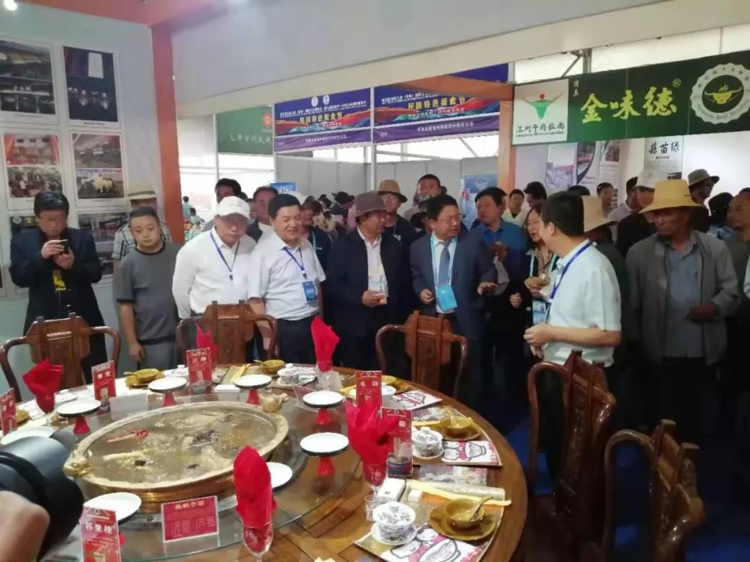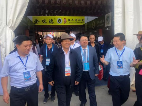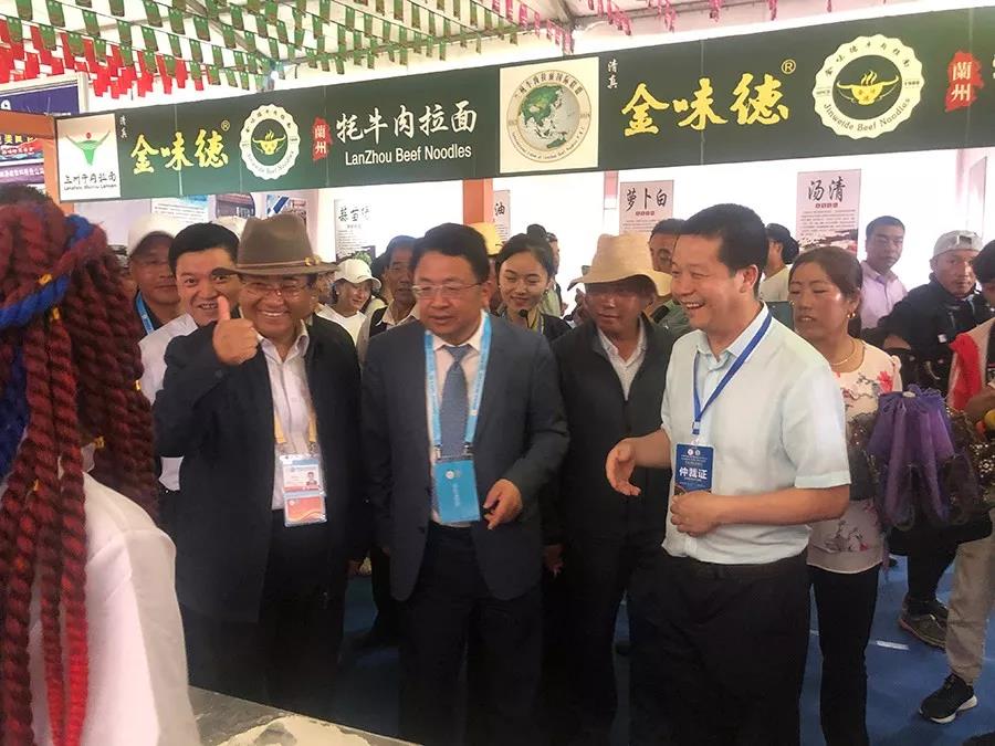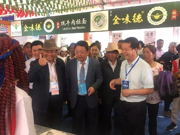 下午,甘肅省商務(wù)廳副廳長任福康,甘南州人大常委會主任安錦龍與諸位領(lǐng)導(dǎo)親臨名族特色美食會場參觀。金味德拉面文化產(chǎn)業(yè)集團(tuán)董事長梁順儉陪同參觀金味德牛肉拉面展館主會場。
