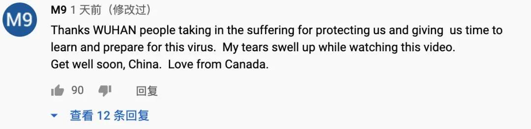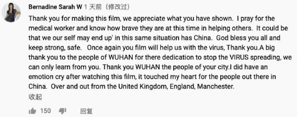 英國網友Bernadine Sarah W評論:“感謝這部紀錄片,它為我們提供了抗擊疫情的寶貴經驗。非常感謝武漢人民用他們的獻身精神阻止了病毒進一步傳播。我們應該向他們學習。感謝武漢人民。”