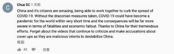 “中國和中國人民真的很棒,能夠團結起來防控疫情。如果不采取嚴厲的措施,新冠肺炎可能在很短的時間內成為世界性流行病,死亡人數和經濟損失會更加嚴重。”網友Chua SC稱贊道。