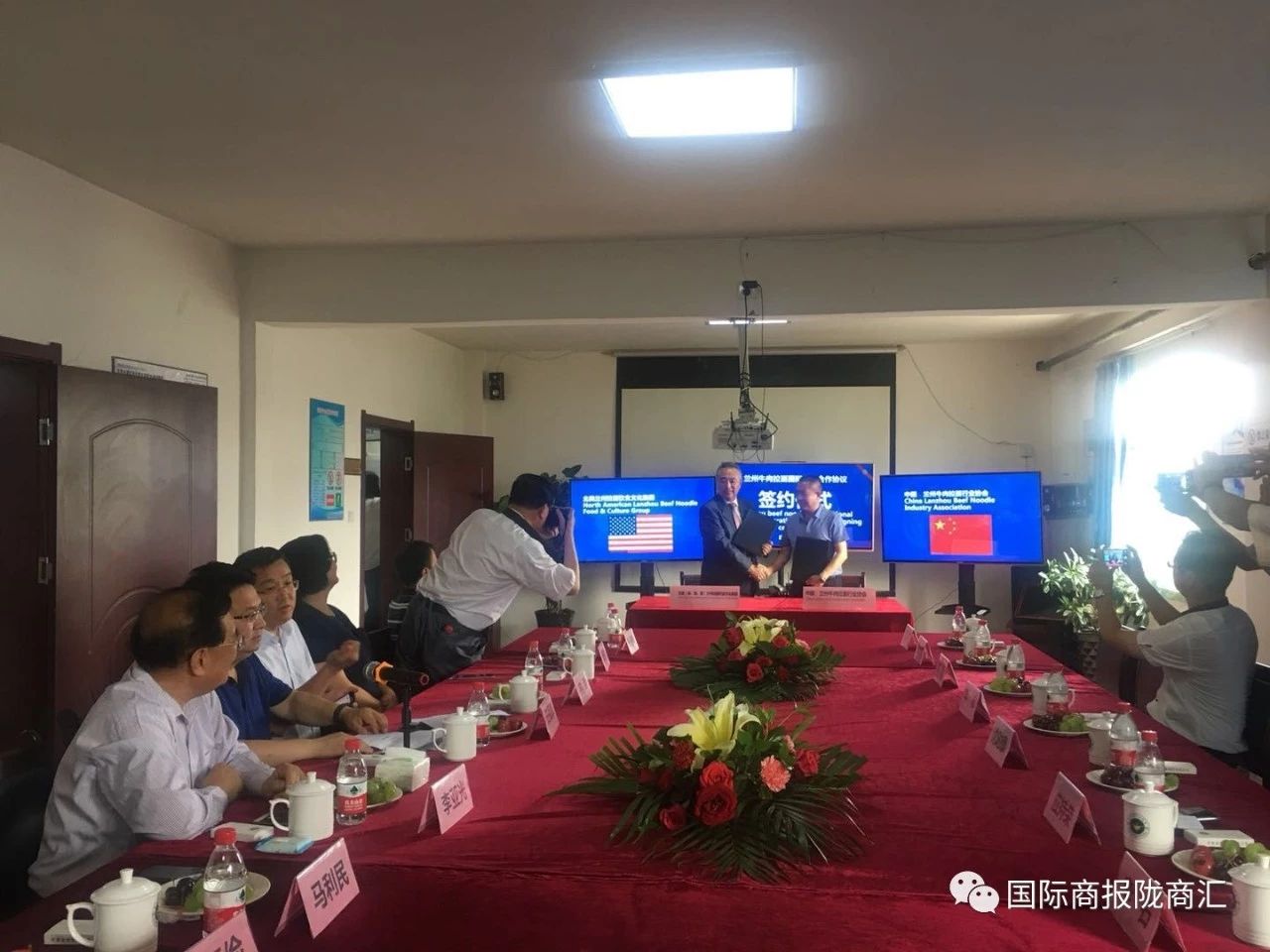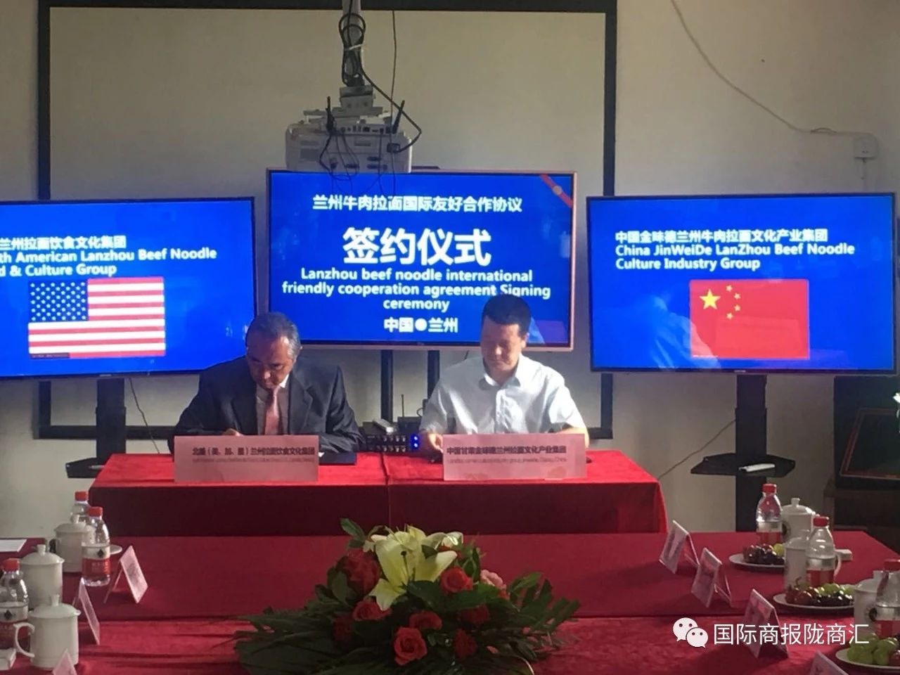 6月24日,參加2018中國面條博覽會的數(shù)十位中外嘉賓在甘肅省商務(wù)廳、甘肅省人社廳、甘肅省外事辦有關(guān)領(lǐng)導(dǎo)陪同下,前往蘭州金味德拉面公司下屬企業(yè)、培訓(xùn)學(xué)校參觀交流。當(dāng)日上午,美國南加州華人華僑商會會長、北美蘭州拉面餐飲文化集團(tuán)董事長應(yīng)持榮同蘭州牛肉拉面協(xié)會會長馬利明簽訂戰(zhàn)略合作協(xié)議;同蘭州金味德牛肉面文化產(chǎn)業(yè)集團(tuán)董事長梁順儉簽訂意向性合作協(xié)議。