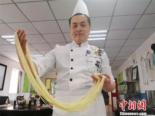 來自哈薩克斯坦的留學生赤龍展示拉出的“毛細”面型。毛細是牛肉面中最細的一道面食,成型后“細如發絲”�!∈缝o靜 攝