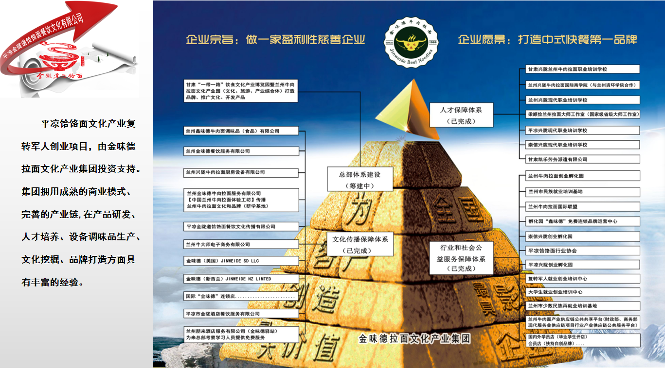 平涼饸饹面文化產業項目是甘肅金味德拉面文化產業集團投資打造的甘肅第二張面條新名片;是以崆峒養生道源文化為載體,以平涼饸饹面為龍頭,挖掘宣傳平涼饸饹面歷史起源文化,結合多元化養生美食經營創新發展,是集平涼饸饹面文化推廣、研學體驗、標準化生產、新產品研發、技能培訓、產業供應鏈信息化共享平臺、平涼饸饹面品牌連鎖加盟、廚房配套設備生產研發、勞務輸出等功能為一體具有顯著平涼地域特色的文化傳播公司。形成完善平涼饸饹面文化、建設饸饹面產業供應鏈,打造“平涼饸饹面”品牌,將平涼創建成為《中國饸饹面之鄉》。