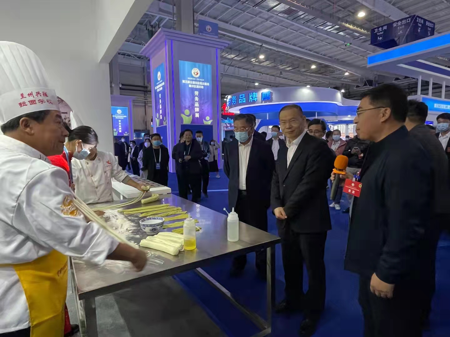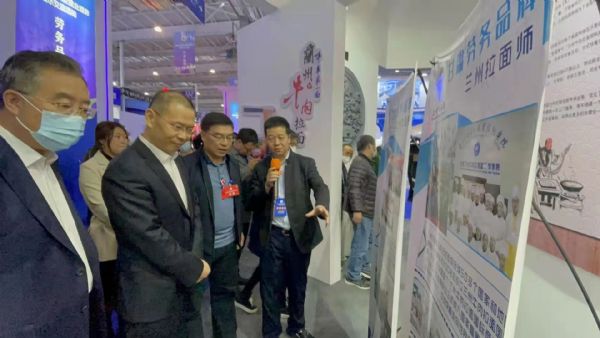 人社部副部長在甘肅省人社廳領(lǐng)導(dǎo)陪同下考察甘肅勞務(wù)品牌展廳,參觀中國勞務(wù)品牌甘肅蘭州拉面師展位