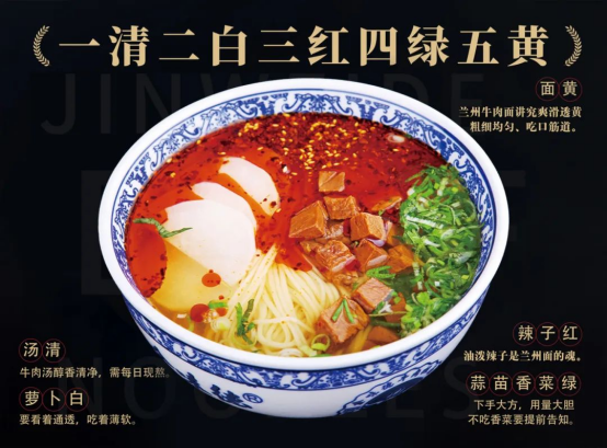 核心產(chǎn)品傳統(tǒng)蘭州牛肉拉面(蘭州人俗稱牛肉面)以“一清(湯清)、二白(蘿卜白)、三紅(辣椒油紅)、四綠(香菜蒜苗綠)、五黃(面條黃亮)”的感官特色和咸、鮮、辛、辣、微麻的口感,神奇的非遺技藝、出餐快捷(每分鐘拉出4-8碗不同形狀面條的出餐速度)而聞名于世,被譽為東方第一快餐,與西方炸雞漢堡齊名,贏得世界美食愛好者喜愛。