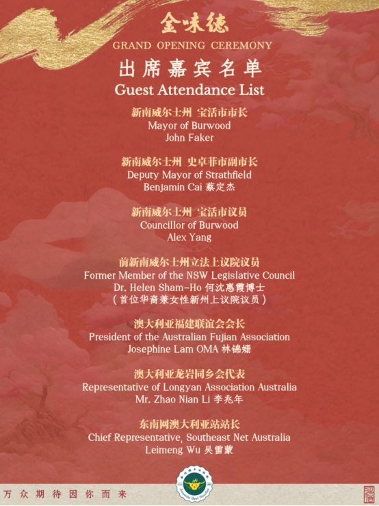 開業(yè)當天,熱鬧非凡。澳大利亞Burwood市長John、Strathfield(澳大利亞史卓菲市)副市長蔡定杰、市議員AlexYan、澳大利亞首位華人議員何沈慧霞、澳大利亞華人商會代表、福建鄉(xiāng)情聯(lián)誼會會長林錦姍OAM、福建甫田商會會長戴兼凡、澳大利亞餐飲界代表及媒體、金味德拉面文化產(chǎn)業(yè)集團國際部技術(shù)總監(jiān)楊愛國等嘉賓蒞臨現(xiàn)場共同參加了開業(yè)慶典。