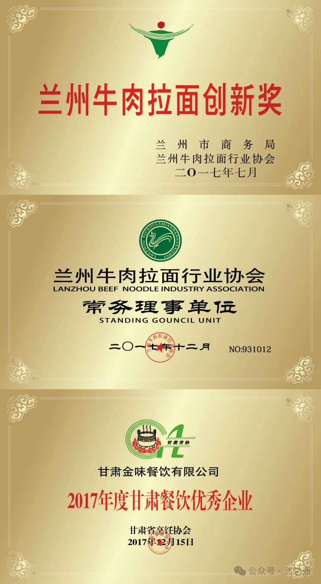 五、甘肅蘭州各級政府主管部門、行業協會給所有蘭州牛肉拉面企業頒發的榮譽證書。