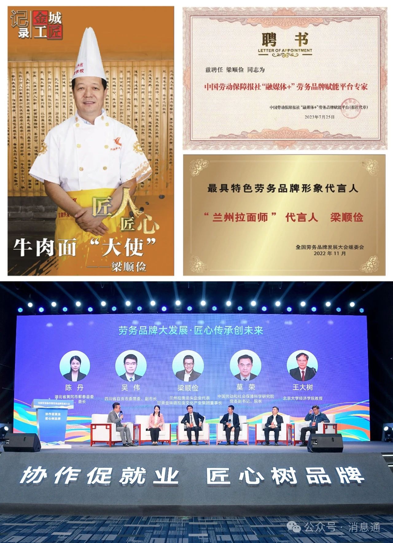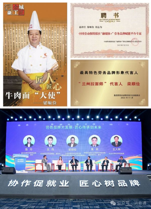 八、2022年8月,甘肅“蘭州拉面師”在人社部組織的全國特色勞務品牌評選中,被評為中國20個最具特色的勞務品牌之一。2023年9月,作為蘭州拉面龍頭企業代表參加了勞務品牌會議并作為訪談嘉賓。