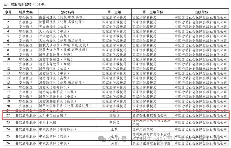 近日,人力資源社會保障部公布第五批技工教育和職業培訓 “十四五” 規劃教材目錄。由甘肅省人力資源和社會保障廳、蘭州市人力資源和社會保障局組織指導,甘肅金味德拉面文化產業集團、甘肅興隴蘭州牛肉拉面職業培訓學校牽頭組建編審團隊,蘭州牛肉面非遺傳承人梁順儉主編,中國勞動社會保障出版社出版的《蘭州牛肉拉面制作》教材成功入選。 該教材是在梁順儉先生2007 年主編的行業首部技術專著《蘭州牛肉拉面寶典》基礎上,經多年打磨、多次修訂完善而成,是人力資源社會保障部蘭州牛肉拉面制作專項職業能力考核指定教材,填補了蘭州牛肉拉面行業百余年來無國家統一教材的空白。 教材同步配套中英文線上數字化課程,既是專項職業能力考核培訓教材、非物質文化遺產技藝傳承與傳播叢書,也是甘肅興隴蘭州牛肉拉面職業培訓學校培養全國大中專院校拉面專業師資的核心教材,更是職業標準制定、高職教材開發的重要參考依據。 此次入選國家級 “十四五” 規劃教材,標志著蘭州牛肉拉面技藝正式邁入標準化、數字化、職業化新階段,為蘭州牛肉拉面產業人才培養、品牌高質量發展提供有力支撐,為中式快餐走向國際市場夯實基礎,面向海外職業院校的英文課程也即將推出。